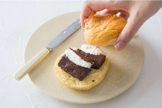 広島空港前で展開する体験型食のテーマパーク「八天堂ビレッジ」の「天空カフェ&ファクトリー(広島県三原市)」で、上記コラボセットでおすすめする‟サンド”を販売いたします。くりーむパン「生クリーム&カスタード」にガトーショコラ、チーズケーキを挟み2種のお味をご用意します。