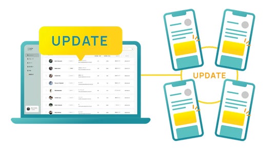 情報の一括更新新部署の設立、新サービスのリリースや、サイトの刷新など、全社で共有すべき情報を一括で更新できます。また、部署や役職ごとにタグを付与し、タグ毎に一括で更新することも可能です。営業部門には最新の商談資料を、採用担当には季節毎に採用メッセージを変更し表示する、といった運用ができます。