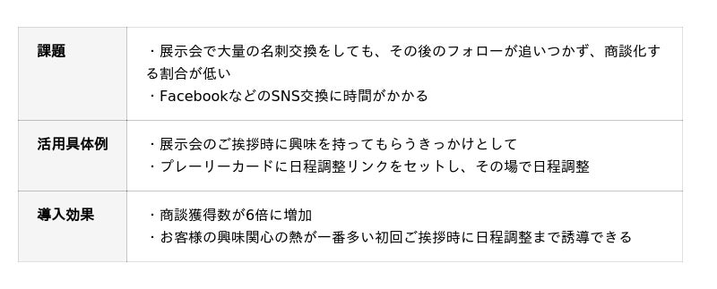 営業の現場では、初回接触から次のアクションへいかにスムーズにつなげるかが重要です。プレーリーカードを活用することで、名刺交換と同時に日程調整ツールへ誘導したり、会社紹介資料や導入事例をその場で共有したりすることが可能になります。