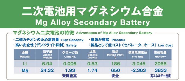 ※2 参考 リチウムイオンに代わる未来の電池 新開発「マグネシウム合金二次電池負極用新合金」 開発者向けに負極材サンプルの試験提供を開始(2020年12月15日付プレスリリース)