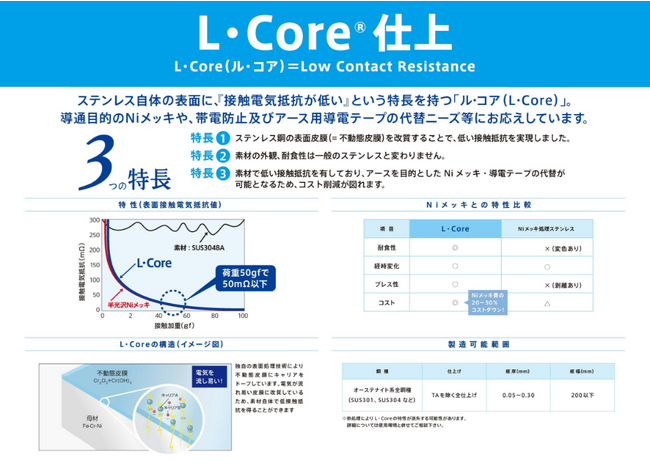 2.ステンレス鋼でありながら低接触抵抗を実現したL・Core、L・CoreII仕上