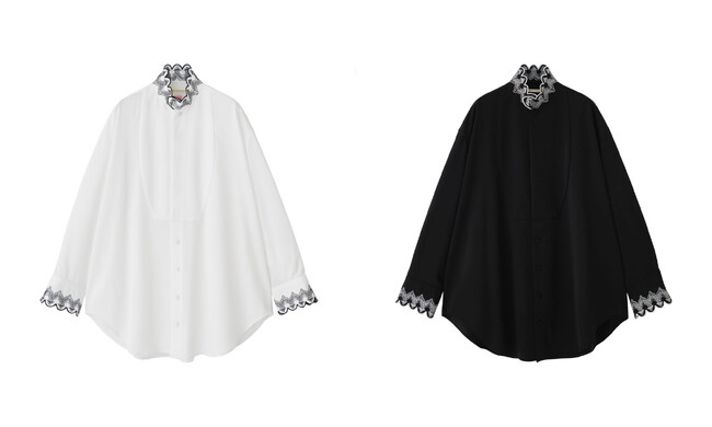 HARUNOBUMURATA でも人気の高いシャツ“GWEN”ベースに FETICO が得意とする刺繍デザインを施した、特別な一着は、 まるでドレスのような、オーバーサイズなシャツのデザインはシャツとしても、ミニワンピースとしても、羽織としても着用可能。