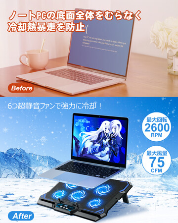 この冷却パッドは、6つのファンが分離・独立していて、隅々までカバーできる配置になっています。Max回転数3000±10%rpm,Max風量75CFMの冷却ファンによる冷却風が絶えずPC底面に吹きつけ、高熱伝導率の金属メッシュで、ノートPC底面に蓄積した熱を吸収し、PC内部が高温になることを防止します。