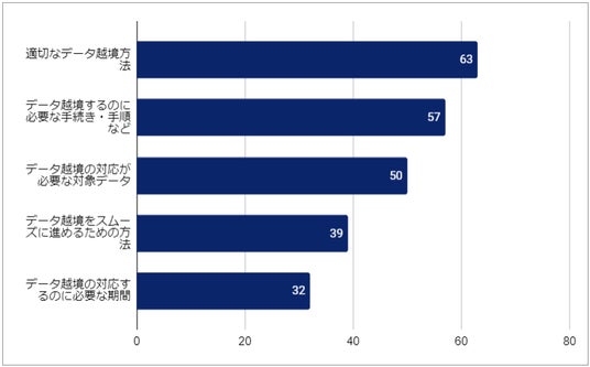 ■複数回答による調査をした結果、「適切なデータ越境方法」が一番多く、続いて「データ越境するのに必要な手続き・手順など」「データ越境の対応が必要な対象データ」となりました。また「データ越境をスムーズに進めるための方法」「データ越境の対応するのに必要な期間」とも答えていることから、データ越境への対応を前向きに検討している企業が多いと読み取ることができます。