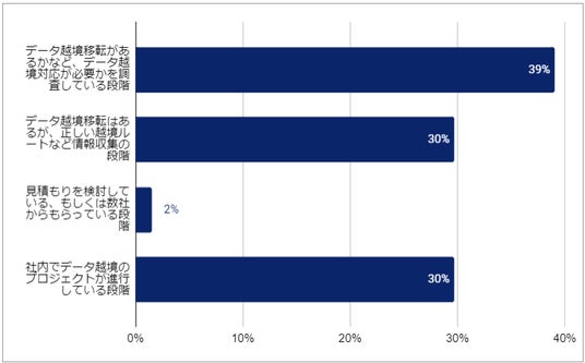 ■情報収集等の活動が70%近く、一方で対応を進める予定・すでに進めている企業は30%程度中国個人情報保護法におけるデータ越境への対応について、情報収集も含め何らかの対応を進めている状況が前提となります。情報収集等を実施している企業は70%近くと高い水準ではあるものの、実際に対応を進める予定・すでに進めている企業は30%程度にとどまることが判明しました。