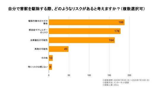 「自分で害獣を駆除する際、どのようなリスクがあると考えますか?(複数選択可)」(n=250)という質問では、「ケガや事故(188件)」「感染症やアレルギー(178件)」「法律違反の可能性(164件)」が上位を占めました。