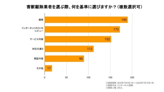 「害獣駆除業者を選ぶ際、何を基準に選びますか?(複数選択可)」(n=250)の質問に対しては、「価格(190件)」が最も多く、次いで「口コミ・レビュー(172件)」「サービス内容(152件)」「対応の速さ(112件)」が続きました。