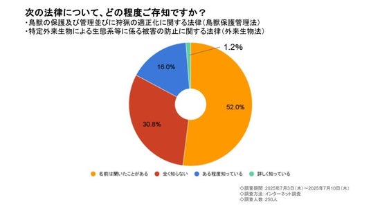 「『鳥獣保護管理法』や『外来生物法』について、どの程度ご存じですか?」(n=250)と尋ねたところ、「名前は聞いたことがある」との回答が52.0%で最多となり、「ある程度知っている(16.0%)」「詳しく知っている(1.2%)」と答えた人は合わせても少数にとどまりました。