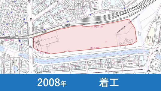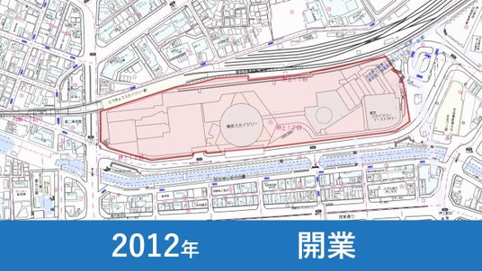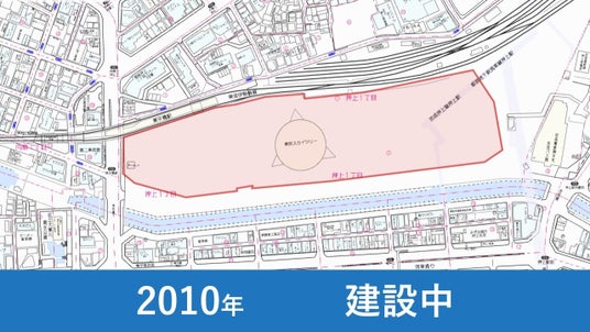 赤色の部分が、現在スカイツリータウンがある場所になります。1995年の建設計画前の地図は東武鉄道の貨物駅や、コンクリート工場がありました。2008年に着工が開始され、地図上で更地になっています。2010年は建設中ですが、ゼンリンは建設中の情報に関しても地図に反映をしております。2021年には開業しスカイツリー全体の情報が反映されました。このように変遷を地図上で可視化することが可能です。