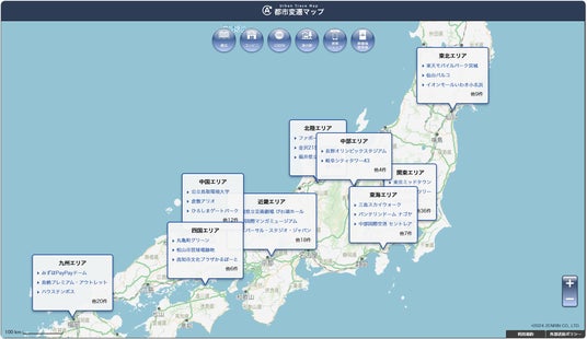 - 時空間データベースが保有する1994年以降の全国の過去地図データの中からランドマークに着目し、当社が選定した全国133ヵ所のランドマークの過去地図と現在の地図を年代別に比較して見ることができます。
