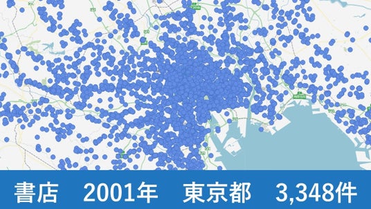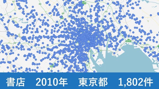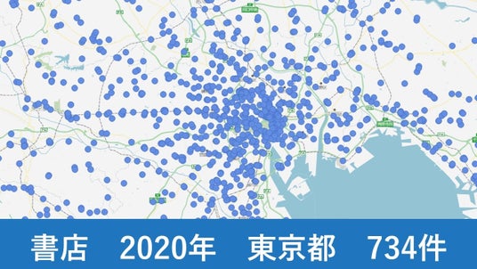 地図上に書店数を表示しています。2001年の東京都の書店数は3,348件でした。2010年は1,802件で、スマートフォンの普及に伴い大きく減少した事が分かります。さらに、新型コロナウイルスが感染拡大した2020年は734件で、書店数の大幅な減少が地図上から読み取れます。