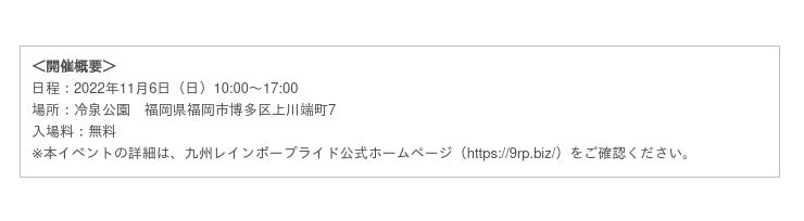 ライフネット生命保険株式会社 (URL:https://www.lifenet-seimei.co.jp/ 本社:東京都千代田区、代表取締役社長:森亮介)は、2022年11月6日(日)に福岡市博多区で開催される「九州レインボープライド2022」にブース出展することをお知らせします。