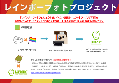 2022年のテーマは、「あいをつなごう!~ひろがる「わ」の世界~」。本イベントのライフネット生命のブースでは、「レインボーフォトプロジェクト」を実施します。本プロジェクトは、ブース内で写真撮影をしていただいたお客さま一人あたり100円を当社が積み立て、その資金を元にLGBTQに関する児童書を購入し、購入した書籍を全国各地の図書館や学校に寄贈する活動です。また、今回はコロナ禍での開催ということもあり、ブース来訪者にレインボー柄のマスクを配布する活動も行います。