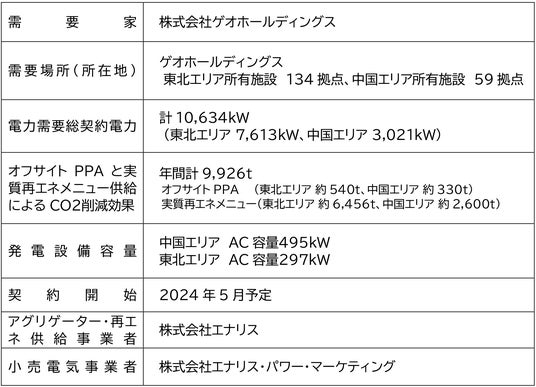 株式会社エナリス(東京都千代田区、代表取締役社長 都築実宏、以下「エナリス」)および株式会社エナリス・パワー・マーケティング(東京都千代田区、代表取締役 内田泰裕、以下「EPM」)は、株式会社ゲオホールディングス(愛知県名古屋市中区、代表取締役社長執行役員 遠藤結蔵、以下「ゲオホールディングス」)と、太陽光発電によるオフサイトPPA[1] に関する契約(以下「本契約」)を締結しました。