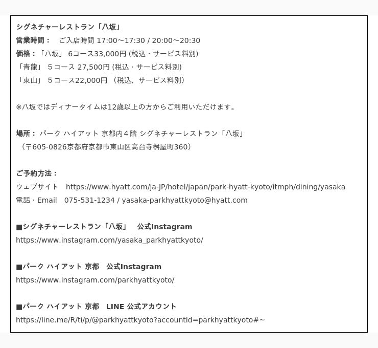 上記のメニューのほかにも、アミューズとしてミモレットをまとった和歌山県産足赤海老、カニ出汁で炊き上げた京丹波産のコシヒカリに、旬の九条ねぎや、丹波黒大豆を品種改良した紫頭巾枝豆、銀杏、毛ガニを合わせて銅鍋で仕上げた、既存の鉄板焼のガーリックライスとは一線を画す「八坂ライス」など、アミューズからデザートに至るまで、刻一刻と表情を変える京都市街を背景に、シアトリカルな鉄板焼のダイナミズム、フレンチの躍動感と繊細さを目と舌で存分にご堪能いただけます。小山の指揮のもと、「八坂」のチームが創り出す、新たなダイニングエクスペリエンスをぜひご体験ください。東山の丘の上で皆様を心よりお待ちしております。