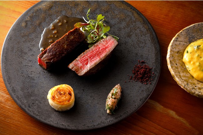 シグネチャーメニューのハイライトとして、関西地域で最もエクスクルーシブな近江牛のテンダーロインと、極上の熟成肉で知られる京都の「京中」からの熟成リブロースをご用意します。卵黄のサバイヨンソースは京都のくるみオイルを少量加え、お一人ずつ、召し上がる直前にお客様の目の前で仕上げてご用意いたします。卵黄のサバイヨンソースや紫黒米(古代米)を原材料にしたロゼワインを思わせる日本酒「伊根満開」と、赤ワインを合わせて炊き上げたお塩で、多彩な香り、味わいとともに最高級の和牛をご堪能ください。