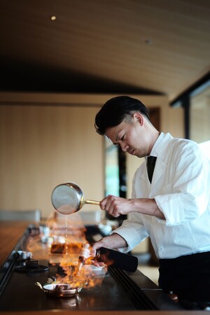 7月に就任した小山は自らが日本各地の上質な素材を厳選し、そのポテンシャルを最大限に引き出す鉄板焼と、フランスで学んだその調理技法とのシナジーで、新しい京都の鉄板焼き文化を発信するイノベーティブなメニューを考案しました。瓦屋根が波打ち、八坂の塔を主役とする京都の伝統的な街並みがパノラマに広がる眺望を背景に、目前で繰り広げられる新たなダイニングエクスペリエンスをご体験ください。