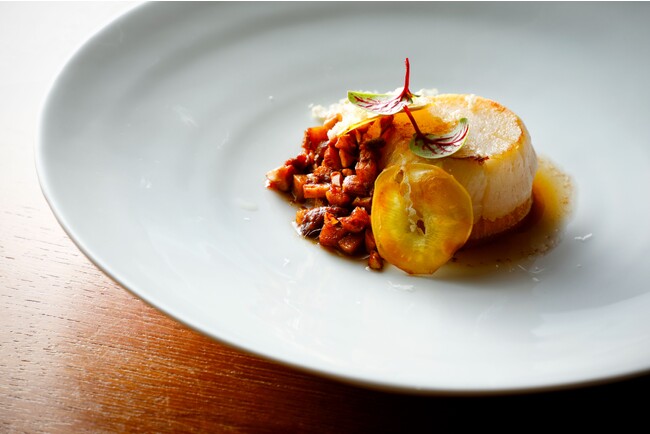 柿と肉厚な北海道産帆立貝は鉄板の上でラム酒でフランベし、その甘味と旨味を引き出します。丹波栗、アーモンド、アンチョビを焦がしバターでソテーし、レモン汁で味を調えたソースは、それぞれのテクスチャーの違いと、さらにそれが口の中で一体となる奥深い味わいをお楽しみいただけます。丹波栗の付け合わせが秋を感じさせる季節感のある前菜です。