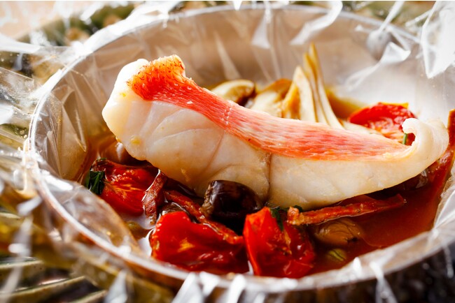 鉄板で作り上げる小山ならではのパピヨットは、鮮魚とともにセミドライのトマト、チョリソー、オレガノ、ベルモットやフォンといった西洋の食材と、松茸をふんだんに使用し、個性ある食材をまとまりある一品に仕上げました。香りや旨味を逃がさないようふっくら火入れされた素材から出るスープと、松茸がそれぞれの風味を引き立て合い芳醇な香りが広がります。