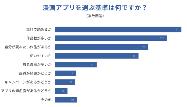 また漫画アプリを選ぶ基準は「無料で読めるかどうか」が最も多く、漫画アプリに対する改善要望も「無料」に言及したものが多く寄せられました。