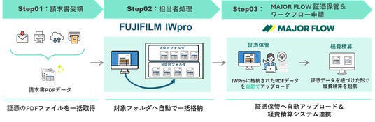 そのようなお声にお応えし、このたび「MAJOR FLOW 証憑保管」は、「FUJIFILM IWpro」との連携に対応し、お客様のDXを実現するエコシステムを目指す「FUJIFILM IWpro パートナーソリューション」として認定されました。「FUJIFILM IWpro」は、クラウド上のワークスペースに紙やメール、FAXなどで受け取る請求書を集約することができます。「MAJOR FLOW」と連携することにより、請求書の支払いまでをワンストップで対応することが可能となり、複数の業務担当者が請求書管理を行っているお客様の負担軽減に貢献します。