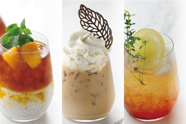 力強いボディ感をもつアッサムを使用した『リッチバニラ・ロイヤルミルクティ』、トロピカルに愉しむアールグレイ『チアシードココナッツのマンゴーティ』、ストロベリーティとレモンが爽やかな『レモンとベリーのティエイド』3種類のラインナップ。冷たい夏のティータイムをお愉しみください。