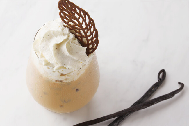 充実したコクと力強いボディ感をもつアッサムのロイヤルミルクティに、バニラエスプーマをたっぷり絞ったリッチでクリーミーな口あたり。パプワニューギニア産の上質なバニラビーンズを使用し、フレッシュなバニラクリームに仕立てています。可愛らしい紅茶のチュイルがアクセント。