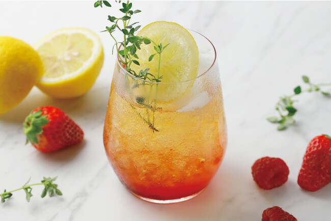 リプトンのストロベリーティをベースに、苺とラズベリーのソース、自社のアイスクリーム工房で作るレモンソルベをソーダで割りました。香り豊かなレモンタイムとイタリア産レモンの砂糖漬けを飾り、爽やかなレモンと甘酸っぱいベリーを存分に楽しめるドリンクです。
