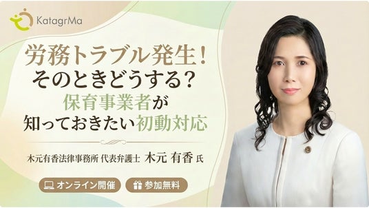 株式会社カタグルマ(本社:東京都千代田区、代表取締役社長/CEO:大嶽 広展)は、2026年2月17日(火)・18日(水)の2日間、保育事業者を対象としたオンラインセミナー『労務トラブル発生!そのときどうする?保育事業者が知っておきたい初動対応』を開催いたします。