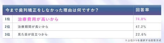 また、歯列矯正をしたことのない人のうち約3人に1人が、矯正治療に興味はあるものの、費用の高さや治療期間の長さ、見た目などの懸念から実際に治療を受けるまでに至っていないことも明らかになりました。(自社調べ)