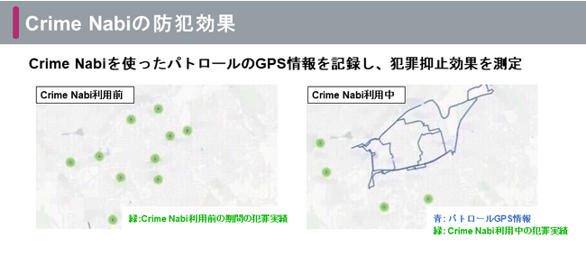また、実証期間中にはパトロールのGPS情報をモバイルアプリケーションを通じて記録し、これを用いて更に精緻な効果検証を実施しました。下記はある地区の犯罪予測を活用したパトロールの防犯効果の事例です。左側がCrime Nabi利用前、右側がCrime Nabi利用中の全く同じエリアの犯罪発生マップです。緑が犯罪発生地点の集積、青がパトロールのGPS情報です。特に犯罪予測を活用しパトロールしたエリアで、PoC期間中は、PoC期間前と比較し犯罪が減少しています。