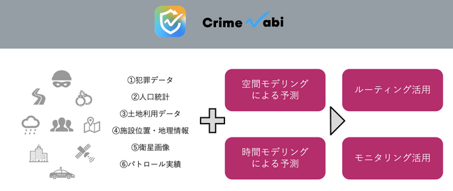 当社は高精度・高速な独自手法を含む犯罪予測アルゴリズムをもとに、犯罪予測システム「Crime Nabi」を開発してきました。その予測結果を元に犯罪発生率が高い箇所を多く通る最適パトロール経路を策定し、業務計画、モニタリング、業務管理までをサポートする業務支援サービス「Crime Nabi MOBILE/WEB」をリリースし、自治体や政府機関、警備会社向けに提供してきました。