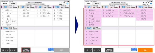 キッチンディスプレイに表示されている伝票明細を一括で選択できるようになりました。まとめて伝票のデータを消込みしたい場合に、従来よりも簡単に操作が可能です。