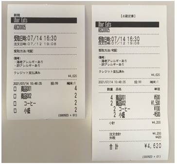 通常のキッチン伝票の上部に外部注文の詳細情報が印字されます。