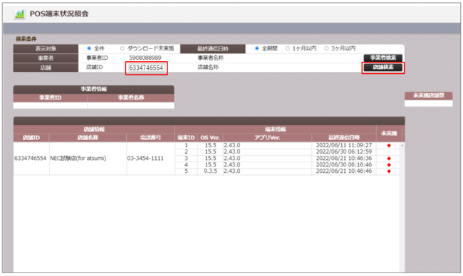 POS端末状況照会画面上で店舗IDを指定して検索できるようになりました。