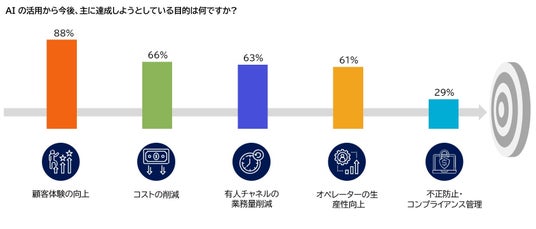これら75%の組織に対して利用の目的について調査を実施したところ、88%が「顧客体験向上」と回答をし、直接顧客へ提供するサービスへのAI活用であっても、サービスを提供するオペレーターサポートのためのAI活用であっても多くの組織が顧客体験向上を目的に導入・活用を進めていることもわかりました。