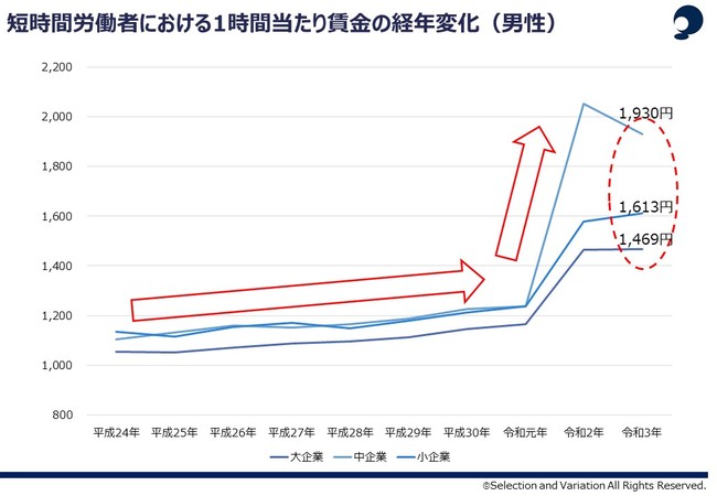 調査の結果、令和3年時点で、大企業および小企業よりも、中企業において男女ともに短時間労働者の1時間当たり賃金が最も高く、男性では1,930円、女性では1,359円であることが分かりました。また、中企業における賃金の高さは、男性において顕著であることが明らかになりました。