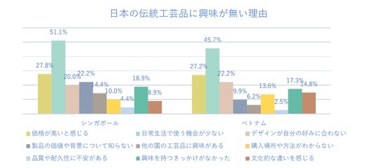 - 伝統工芸品に興味が無い消費者、その理由は、「日常生活で使う機会が少ない」が最も多く、シンガポール51.1%、ベトナム45.7%と約半数。次に「価格が高いと感じる」が、シンガポール27.8%、ベトナム27.2%と約3割が該当。そのほか、両国ともに「デザインが自分の好みに合わない」が約2割程度、「興味を持つきっかけがなかった」人も2割弱となった。