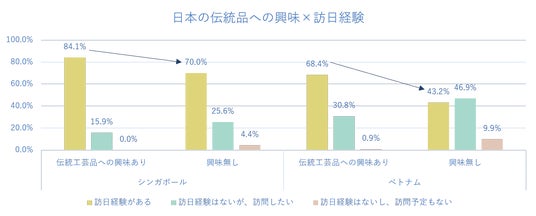 - 伝統工芸品への興味と訪日経験の関係性について、シンガポールでは「伝統工芸品へ興味がある」と回答した人のうち84.1%が「訪日経験がある」と回答。ベトナムでも同様の結果で、訪日経験が日本の伝統工芸品に触れる機会となり、関心を高めている一つの要因と考えられる。