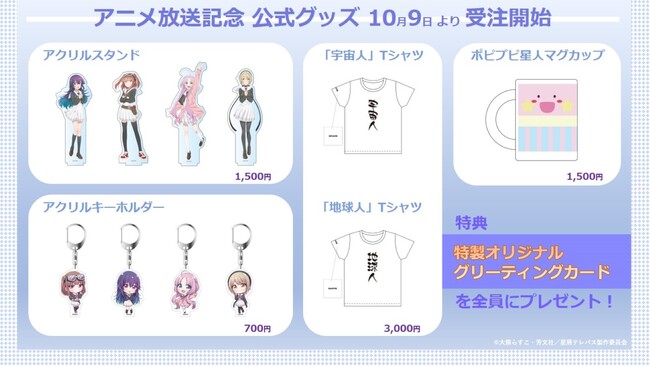 アクリルスタンド、アクリルキーホルダーをはじめ、作中にも登場するユニークなTシャツや主人公・海果(うみか)の妄想する宇宙人<ポピプピ星人>のマグカップがアニメイト通販にて予約受付を開始。新規描きおこしのデフォルメイラストを含むバラエティ豊かなラインナップです。なお対象グッズをご予約いただいた方には、もれなく「特製オリジナルグリーティングカード」をプレゼント致します。