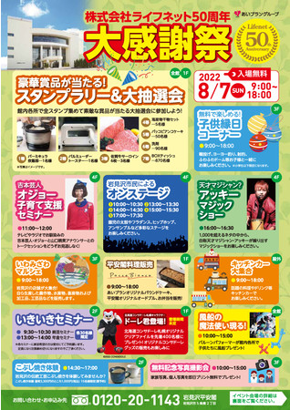 株式会社ライフネットは創立50周年を迎えます。50周年の節目と地域のみなさまのご愛顧に感謝して、2022年8月7日(日)に『大感謝祭』を開催します。ステージイベントや子供縁日、マルシェなど楽しいイベントをご用意しておりますので、ぜひご家族そろってお越しください。