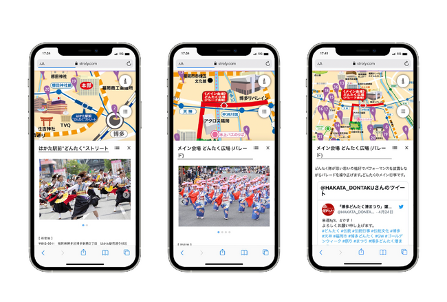 そこでStrolyは直感的に見たいイベントや、行ってみたい会場の情報を直ぐに見つけられる体験をしていただけるデジタルマップ版「どんたくマップ」を作成いたしました。