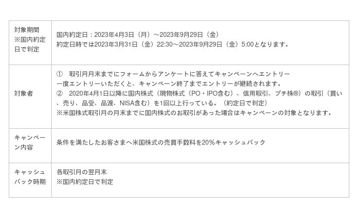 ■外貨決済スタート記念!米国株式売買手数料20%キャッシュバックキャンペーン詳細