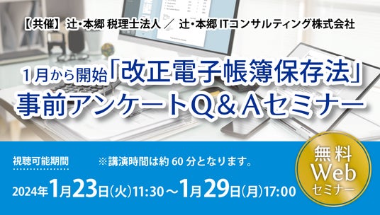 辻・本郷ITコンサルティング株式会社(本社:東京都渋谷区、代表取締役社長:黒仁田 健)は、辻・本郷 税理士法人(本社:東京都新宿区、理事長:徳田 孝司)と、2024年1月23日(火)から2024年1月29日(月)まで、無料セミナー「1月から開始「改正電子帳簿保存法」事前アンケートQ&Aセミナー」を共催します。