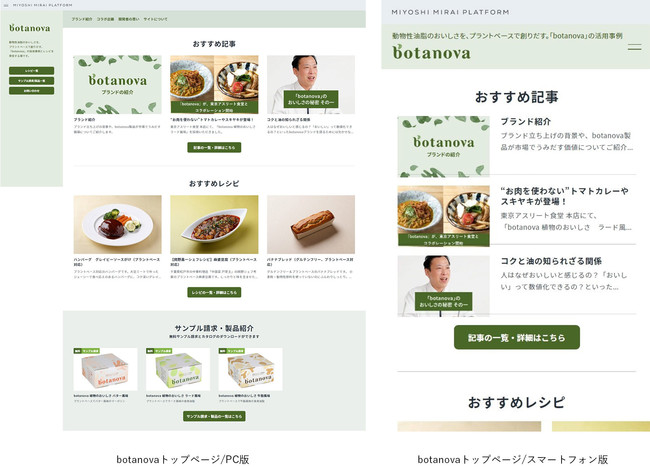 ミヨシ油脂株式会社(本社:東京都葛飾区、代表取締役社長兼CEO:三木逸郎)は、6月28日(火)に動物性油脂のおいしさをプラントベースで創りだす食用油脂ブランド「botanova」の採用事例とレシピを発信するWebサイトを公開しました。