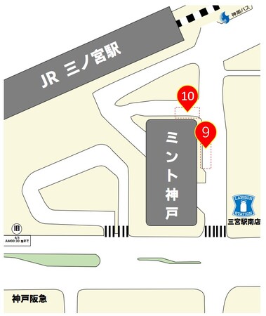 なお4/25(火)までは、道路工事のため、ミント神戸バスターミナル「9番」または「10番」のりばを使用します(4/26(水)以降は、ミント神戸バスターミナル「9番」のりばに変更予定)。