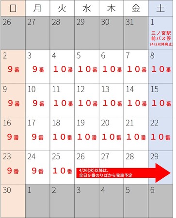 4/25(火)までは、ミント神戸バスターミナル「9番」または「10番」のりばを使用
