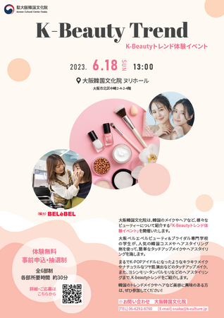 駐大阪韓国文化院は、6.18(日)大阪市内の文化院ホール(北区中崎2-4-2)にて、韓国のメイクやヘアなど、様々なビューティーについて紹介する「K-Beautyトレンド体験イベント」を開催する。