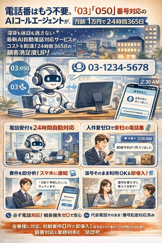 ~「03」「050」番号対応。深夜も休日も、AIがあなたの代わりに電話を受けます~