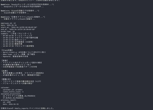 - 日報作成の自動化::一日の活動実績からAIが日報を自動生成し、Slackに自動投稿。全社員がリアルタイムで確認可能